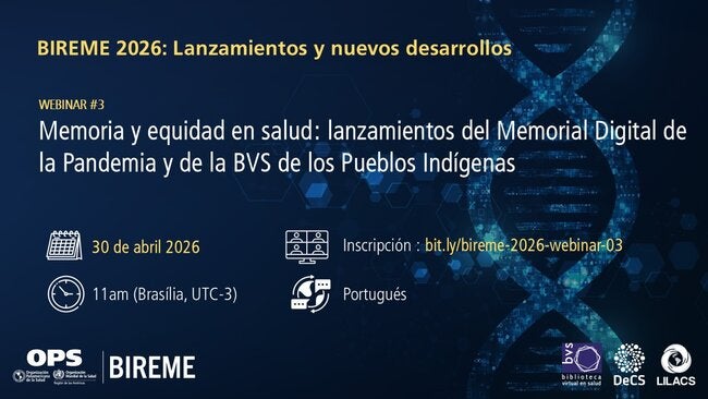 El jueves 30 de abril de 2026, a las 11:00 (hora de Brasilia, UTC-3), BIREME/OPS/OMS realizará la sesión “Memoria y equidad en salud: lanzamientos del Memorial Digital de la Pandemia y de la BVS de los Pueblos Indígenas”, como parte del programa “BIREME 2026: Lanzamientos y nuevos desarrollos”. La sesión destacará iniciativas estratégicas desarrolladas en el marco de la cooperación técnica con socios institucionales, con foco en soluciones digitales, preservación de la memoria en salud y fortalecimiento de redes temáticas.