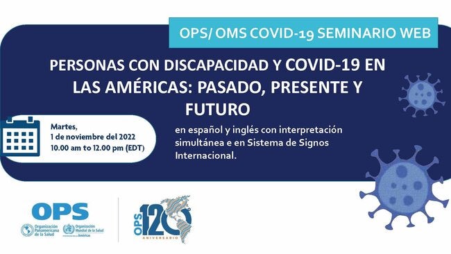 Asista al seminario web "Personas con discapacidad y COVID-19 en las Américas: pasado, presente y futuro" que la unidad de Salud Mental del Depto. de Enfermedades No Transmisibles y Salud Mental ha organizado el martes 1 de noviembre, de 10:00 a.m. a 12.00 p.m. (EDT). En esta sesión, primera de dos partes - la segunda será el 7 de diciembre- se explorarán los desafíos, barreras y lecciones aprendidas durante la pandemia de COVID-19, evaluando la situación actual y las perspectivas hacia el futuro para las personas con discapacidad.