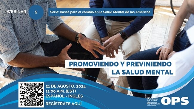 Únase a nosotros el miércoles 21 de agosto de 2024 a las 11:00 a.m. (Washington DC, o EDT) al webinar Promoviendo y previniendo la salud mental. Las intervenciones de promoción y prevención se enfocan en identificar los determinantes sociales para reducir riesgos, fortalecer la resiliencia y crear entornos de apoyo. Estas intervenciones pueden dirigirse a individuos, grupos específicos o poblaciones enteras.