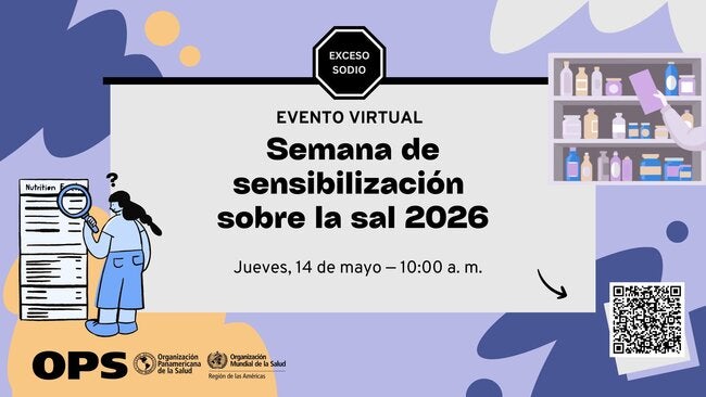 Acompáñenos el jueves 14 de mayo a las 10:00 a. m. (hora de Washington, D. C. o EST), en el evento por la Semana de sensibilización sobre la sal 2026. En este seminario web, se presentarán experiencias de los países en la implementación del etiquetado frontal de advertencia y metas de reducción de sodio, así como herramientas para aplicar el mercadeo social para la reducción del sodio.