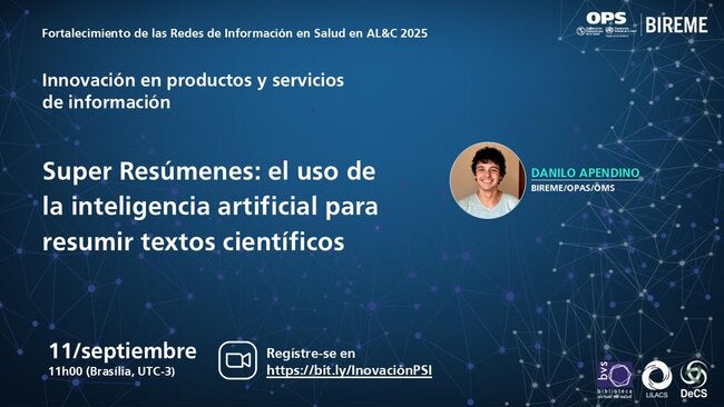 El jueves, 11 de septiembre de 2025, a las 11:00 (hora de Brasilia, UTC-3), BIREME realizará el seminario web “Super Resúmenes: utilizando Inteligencia Artificial para resumir textos científicos”, en el cual se presentará una iniciativa que utiliza Inteligencia Artificial para generar resúmenes ultracondensados de artículos científicos, apoyando la toma rápida de decisiones para el acceso a documentos. Esta iniciativa forma parte del programa de cooperación técnica para el Fortalecimiento de las Redes de Información en Salud en América Latina y el Caribe.