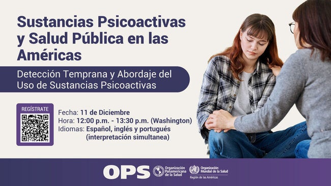 Acompáñenos el jueves 11 de diciembre a las 12:00 p.m. (hora de Washington, D.C. o EST) para el evento "Sustancias Psicoactivas y Salud Pública en las Américas: Detección Temprana y Abordaje del Uso de Sustancias Psicoactivas". El evento tiene como objetivo brindar la evidencia epidemiológica más reciente sobre la carga de enfermedad atribuible al uso de sustancias psicoactivas en las Américas y fortalecer las capacidades de los países de la Región para su abordaje desde la atención primaria, mediante la implementación de herramientas validadas como el ASSIST y el AUDIT.