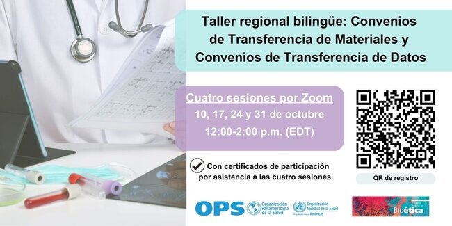 El Programa Regional de Bioética de la OPS lo invita a participar en este taller que tendrá lugar los días martes 10, 17, 24 y 31 de octubre, de 12 a 2 pm, hora de Washington DC.