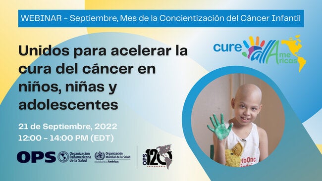 La Organización Panamericana de la Salud hace una cordial invitación al webinar "Unidos para acelerar la cura del cáncer en niños, niñas y adolescentes 2022" , el miércoles, 21 de Septiembre de 2022. Un evento importante para difundir el enfoque principal del conjunto priorizado de intervenciones básicas incluidas en el segundo pilar incluido en el paquete técnico CUREALL como lo es la cobertura Universal de salud el cual puede reducir las dificultades financieras al incluir en forma servicios de apoyo eficaz para facilitar el acceso a los servicios de salud al niño, niña y adolescente con cáncer