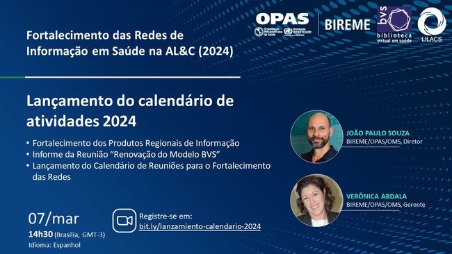 - Lanzamiento del Calendario 2024 de Reuniones para el Fortalecimiento de las Redes de Cooperación, por Verônica Abdala, Gerente de Productos y Servicios de Información de BIREME/OPS/OMS