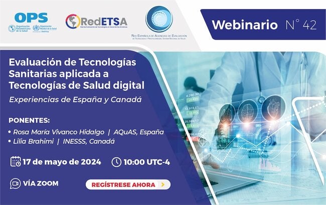 La Organización Panamericana de la Salud y la Red de Evaluación de Tecnologías en Salud de las Américas (RedETSA), en conjunto con la Red Española de Agencias de Evaluación de Tecnologías y Prestaciones del Sistema Nacional de Salud, tienen el gusto de invitarles a una nueva edición del Programa de Webinarios de RedETSA: Evaluación de Tecnologías Sanitarias aplicada a Tecnologías de Salud digital: Experiencias de España y Canadá