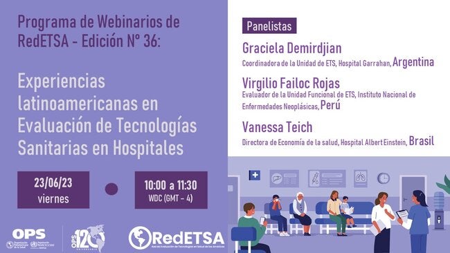 La Organización Panamericana de la Salud y la Red de Evaluación de Tecnologías en Salud de las Américas (RedETSA), invitan a una nueva edición del Programa de Webinarios de RedETSA titulado: "Experiencias latinoamericanas en Evaluación de Tecnologías Sanitarias en Hospitales", a realizarse el viernes 23 de junio, de 10:00 a 11:30hs (EDT/WDC). El mismo contará con interpretación simultánea en español e inglés.