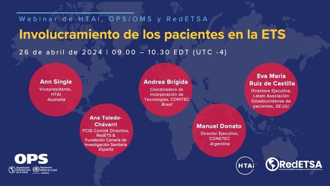 La Organización Panamericana de la Salud y la Red de Evaluación de Tecnologías en Salud de las Américas (RedETSA), en conjunto con Health Technology Assessment international (HTAi) tienen el gusto de invitarles a una nueva edición del Programa de Webinarios de RedETSA: Involucramiento de los pacientes en la Evaluación de Tecnologías Sanitarias.