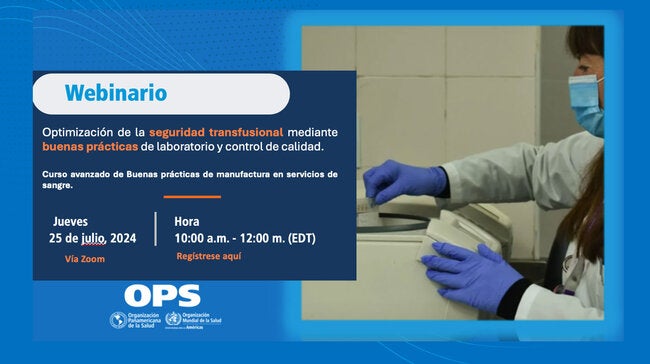 La Organización Panamericana de la Salud tienen el gusto de invitarles al webinario Optimización de la seguridad transfusional mediante buenas prácticas de laboratorio y control de calidad - Curso avanzado de Buenas prácticas de manufactura en servicios de sangre.