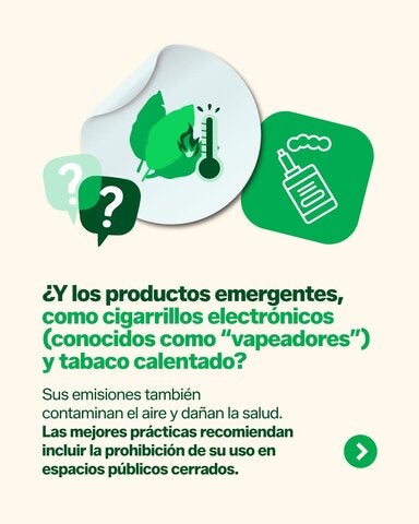 Asimismo, es importante señalar que esta medida ha sido incorporada en distintos mandatos regionales y mundiales. En particular, fue recientemente incluida en la Estrategia y Plan de Acción para Fortalecer el Control del Tabaco en la Región de las Américas 2025–2030, aprobada en octubre de 2024 por todos los Estados Miembros de la OPS. En su Línea Estratégica 1, se establece como objetivo aumentar el número de Estados Miembros con leyes nacionales que garanticen ambientes 100% libres de humo de tabaco en todos los espacios públicos cerrados, lugares de trabajo cerrados y en el transporte público, con una meta de al menos 30 países (línea de base: 24). Asimismo, teniendo en cuenta el contexto actual, esta línea estratégica también contempla la necesidad de abarcar a los productos emergentes en las intervenciones regulatorias de control del tabaco. De esta forma, la reciente Estrategia y Plan de Acción incentiva a continuar los esfuerzos para aplicar las medidas de control del tabaco más costo-eficaces y abordar nuevos desafíos, al tiempo que pone de manifiesto el compromiso de los Estados Miembros para avanzar con la agenda de control del tabaco y las cuestiones emergentes relacionadas.