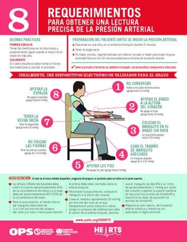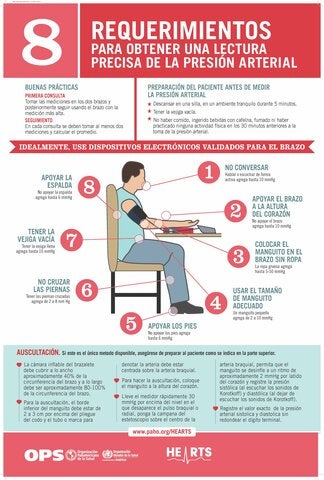 Para obtener una medición precisa de la presión arterial, es necesario adoptar una serie de procedimientos que incluyen la preparación del paciente antes de tomar la presión arterial, la técnica utilizada por el trabajador de la salud, la selección de un espacio libre de ruidos, y el uso de monitores precisos de presión arterial. Las buenas prácticas incluyen hacer las mediciones en los dos brazos, en la visita inicial, y, posteriormente, seguir usando el brazo con la medición más alta. En las visitas de seguimiento, en cada consulta se deben tomar al menos dos mediciones y calcular el promedio