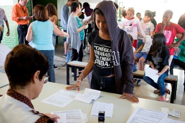 La fila para vacunación en la Escuela Municipal Itamar Martins Ferreira, en Goiânia, capital del estado de Goiás, es larga. Niñas y niños (de 9 a 14 y de 11 a 13 años, respectivamente) esperan para recibir la segunda dosis de la vacuna contra el virus del papiloma humano (VPH). La primera dosis se les ha aplicado seis meses atrás en el mismo lugar.