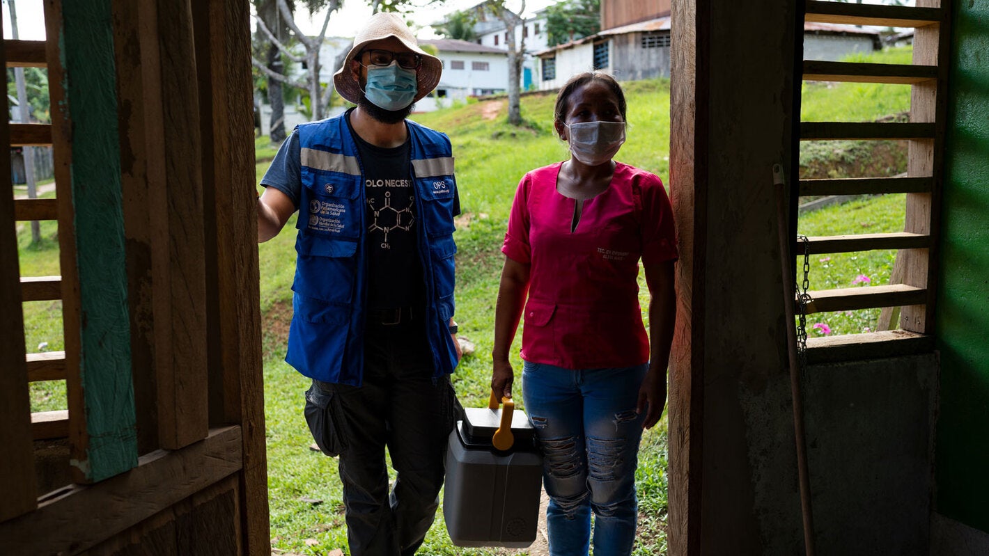 Tras un proceso de concertación con autoridades y líderes de los pueblos indígenas Uitoto, Bora, Okaina y Muinane, la Organización Panamericana de la Salud inicia una intervención para incrementar los servicios de salud durante emergencias complejas, fortalecer la vigilancia con base comunitaria e implementar acciones pedagógicas con enfoque étnico para lograr la prevención de la COVID-19, con énfasis en vacunación, en los poblados amazónicos de La Chorrera, Puerto Arica y Tarapacá.