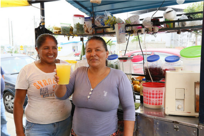 Paquita es una de los más de 35 vendedores ambulantes que dejaron de ofrecer alimentos ultraprocesados, como snacks y gaseosas, fuera de nueve escuelas de El Recreo I y II, del cantón Durán, una zona vulnerable ubicada frente a Guayaquil, en Ecuador. Ahora, en cambio, venden jugos naturales, frutas y tortillas preparadas sin aceite saturado.