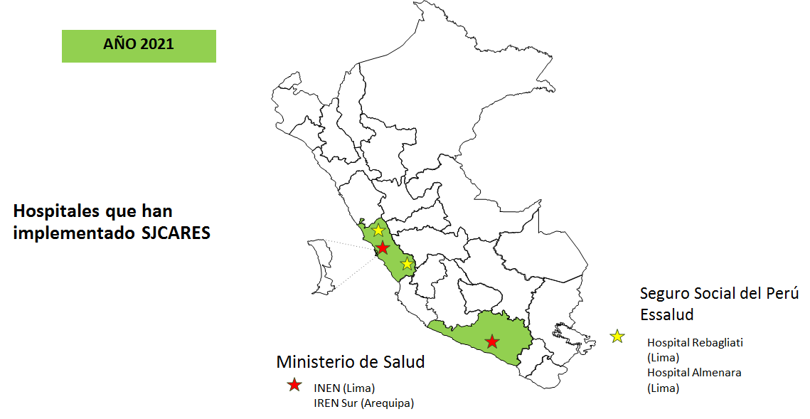 Gracias al apoyo de St. Jude Children’s Research Hospital, centro colaborador de la OMS en la Implementación de la Iniciativa Mundial contra el cáncer infantil, se logró la firma de Alianzas entre St. Jude y 4 Hospitales de Lima y regiones. 3 de estos hospitales: El Instituto Regional de Enfermedades Neoplásicas del Sur, el Hospital Edgardo Rebagliati Martins y el Hospital Guillermo Almenara, también establecieron la firma de acuerdos para la Implementación del SJCARES que es una herramienta informática de medición de los avances en la mejora de la atención y seguimiento continuo de los niños y adolescentes con cáncer.