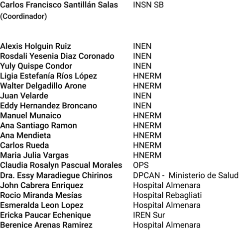 Este proyecto viene siendo implementado con el apoyo de St. Jude Children’s Research Hospital en el Hospital Edgardo Rebagliati y cuenta con la participación del equipo multidisciplinario de manejo del niño con cáncer (Pediatras, Oncólogos y Hematólogos pediatras, Infectólogos pediatras y personal de enfermería).