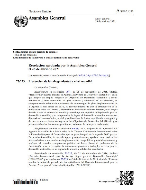 Resolución 75/273: Prevención de los ahogamientos