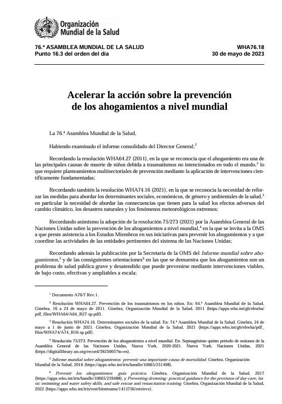 WHA76.18 Resolución - o Acelerar la acción sobre la prevención de los ahogamientos a nivel mundial