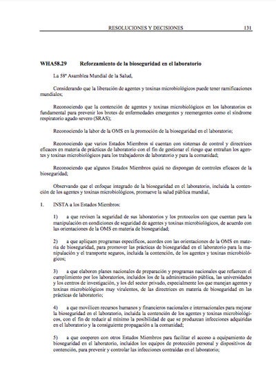 WHA58.29 - Reforzamiento de la bioseguridad en el laboratorio (2005)