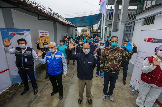 Lima, 06 de junio de 2020.- El Dr. Rubén Mayorga, representante de la Organización Panamericana de la Salud en el Perú acompañó al Ministro de Salud, quien lideró la salida de los equipos de respuesta rápida y de seguimiento clínico que brindan atención domiciliaria a los pacientes con síntomas leves de la Covid-19.