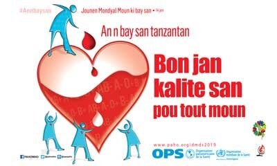 Banner horizontal (digital): Jounen Mondyal Moun ki bay san. Bon jan kalite san pou tout moun (JPG); 2019 (créole, crioulo)