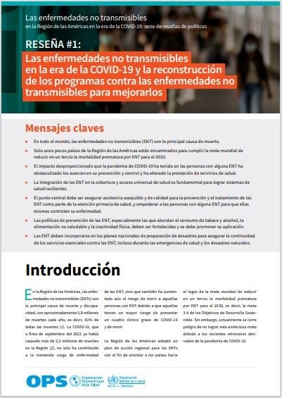 En esta serie de reseñas de políticas sobre las enfermedades no transmisibles (ENT) se abordan temas relacionados con la prevención y el control de las ENT, a fin de sintetizar y difundir la evidencia más reciente, presentar las recomendaciones conexas de la OPS y la OMS y formular consideraciones para mejorar las políticas, los servicios y la vigilancia de las ENT. En ellas se considera el contexto actual de la pandemia de COVID-19 y el período posterior con vistas a construir sistemas de salud más resilientes y prestar apoyo a la transformación digital en el ámbito de la salud. Esta primera reseña de políticas se centra en la situación actual de las ENT y los efectos de la COVID-19. Incluye varias propuestas para mejorar la prevención y el control de las ENT basadas en el enfoque de las “mejores inversiones” de la Organización Mundial de la Salud.