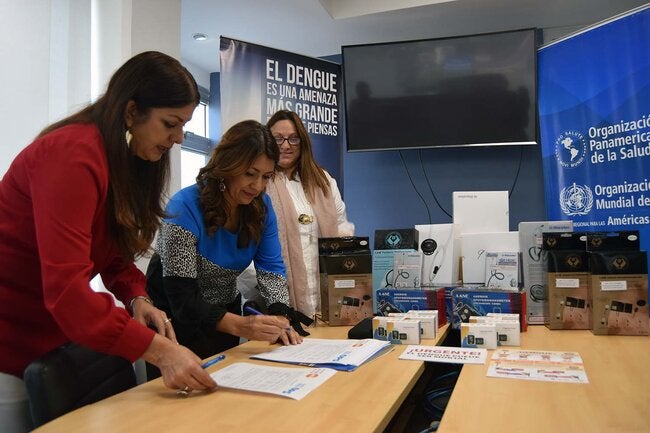 Tegucigalpa, Honduras, 10 de septiembre de 2019 (OPS).- Piedad Huerta Arneros y Cecilia Maurente, Representantes Residentes de la OPS/OMS y UNFPA respectivamente, entregaron hoy a la Licda. Alba Consuelo Flores, Secretaria de Salud un lote de equipo médico valorado en quince mil dólares (US$15,000.00), para adecuar las unidades provisionales de dengue y mejorar la atención de los pacientes que acuden en busca de atención médica ante sospecha de esta enfermedad.