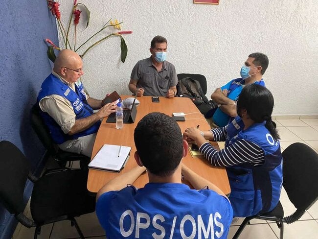 San Pedro Sula, 10 de noviembre de 2020. Ante la situación que se vive en el departamento de Cortés tras el paso de la tormenta tropical Eta, el equipo de la OPS/OMS en terreno liderado por el experto en el manejo de Emergencias y Desastres Dr. Alejandro Santander, sostuvo la primera reunión con la jefa de la región de Salud de Cortés la Dra. Dinora Nolasco y su equipo para analizar la situación de salud del departamento.