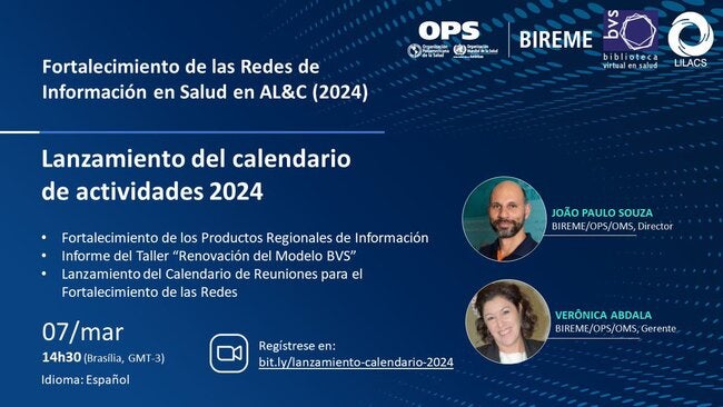 São Paulo, 11 de marzo de 2024 (BIREME/OPS/OMS) - El Webinar de Lanzamiento del Calendario de Actividades 2024 de la Biblioteca Virtual en Salud (BVS) con las Redes de Información en Salud fue realizado en línea el 07 de marzo de 2024. El evento fue organizado por el Centro Latinoamericano y del Caribe de Información en Ciencias de la Salud de la Organización Panamericana de la Salud (BIREME/OPS/OMS), con presentaciones de João Paulo Souza, director de BIREME, y Verônica Abdala, Gerente de Servicios y Productos de Información de BIREME. Asistieron 174 personas de diferentes países de América Latina, el Caribe y otras regiones, como Europa.
