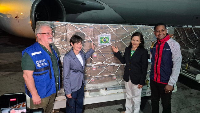 Los insumos llegaron en un vuelo especial de la aerolínea Conviasa desde Sao Paulo, y fueron recibidos en la propia pista por la vicepresidenta sectorial Gabriela Jiménez, el viceministro de Hospitales Jesús Osteicochea, la embajadora de Brasil en Venezuela Elivania Maria de Oliveira y el representante de la OPS en Venezuela, Armando De Negri.