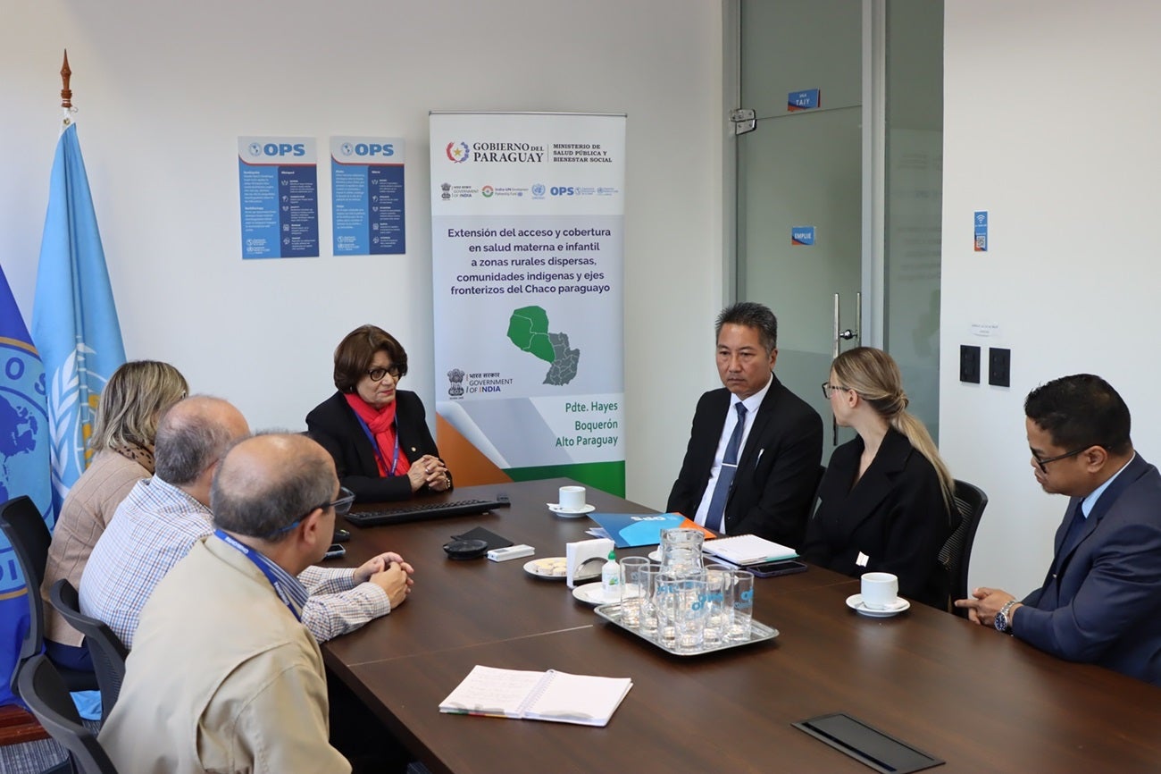 Asunción, 13 de junio de 2025- La Dra. Haydee Padilla, Representante a.i. y equipo de la Organización Panamericana de la Salud/Organización Mundial de la Salud (OPS/OMS) en Paraguay, sostuvieron un encuentro institucional con el encargado de negocios del Gobierno de la India, Aliawati Longkumer, y su comitiva, en el marco del proyecto “Extensión del acceso y cobertura en salud materna e infantil a zonas rurales dispersas, comunidades indígenas y ejes fronterizos del Chaco Paraguayo”.