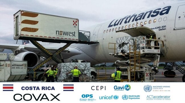 Costa Rica recibió este jueves 13 de mayo 88.800 dosis de vacunas contra COVID-19 adquiridas mediante el Mecanismo COVAX, un esfuerzo global solidario entre la Coalición para la Promoción de Innovaciones en pro de la Preparación ante las Epidemias (CEPI), la Alianza Mundial para las Vacunas e Inmunización (Gavi), el Fondo de las Naciones Unidas para la Infancia (UNICEF), la Organización Panamericana de la Salud (OPS) y la Organización Mundial de la Salud (OMS).