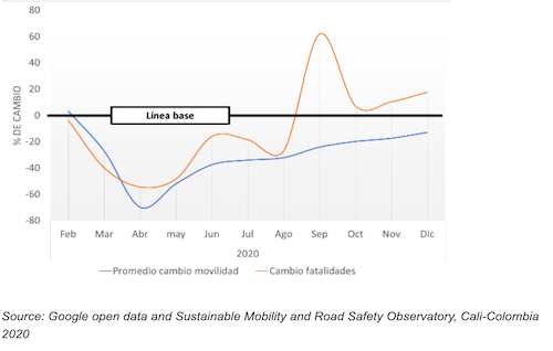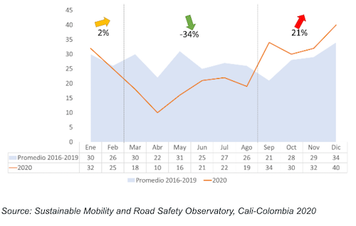 En general, el tránsito en Cali se redujo en un 70% durante los periodos de confinamiento estricto debido a la COVID-19. El número de defunciones y traumatismos por accidentes de tránsito durante el periodo de confinamiento estricto (abril de 2020) también se redujo en comparación con las tasas anteriores a la pandemia: en abril, los traumatismos se redujeron en un 76% y las defunciones en un 55%. No obstante, habida cuenta de que la circulación general había disminuido en un 75%, la menor tasa de reducción de las defunciones implica que la gravedad de los accidentes de tránsito podría haber aumentado durante los periodos de confinamiento por la pandemia (véanse las figuras 1 y 2).