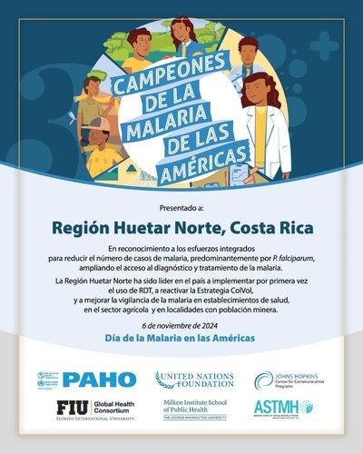 San José, 15 de noviembre de 2024. La Región Huetar Norte de Costa Rica fue galardonada hoy con el premio Campeones de la Malaria, otorgado anualmente por la Organización Panamericana de la Salud a países, estados miembro o localidades que han realizado acciones sobresalientes en el abordaje de la malaria.