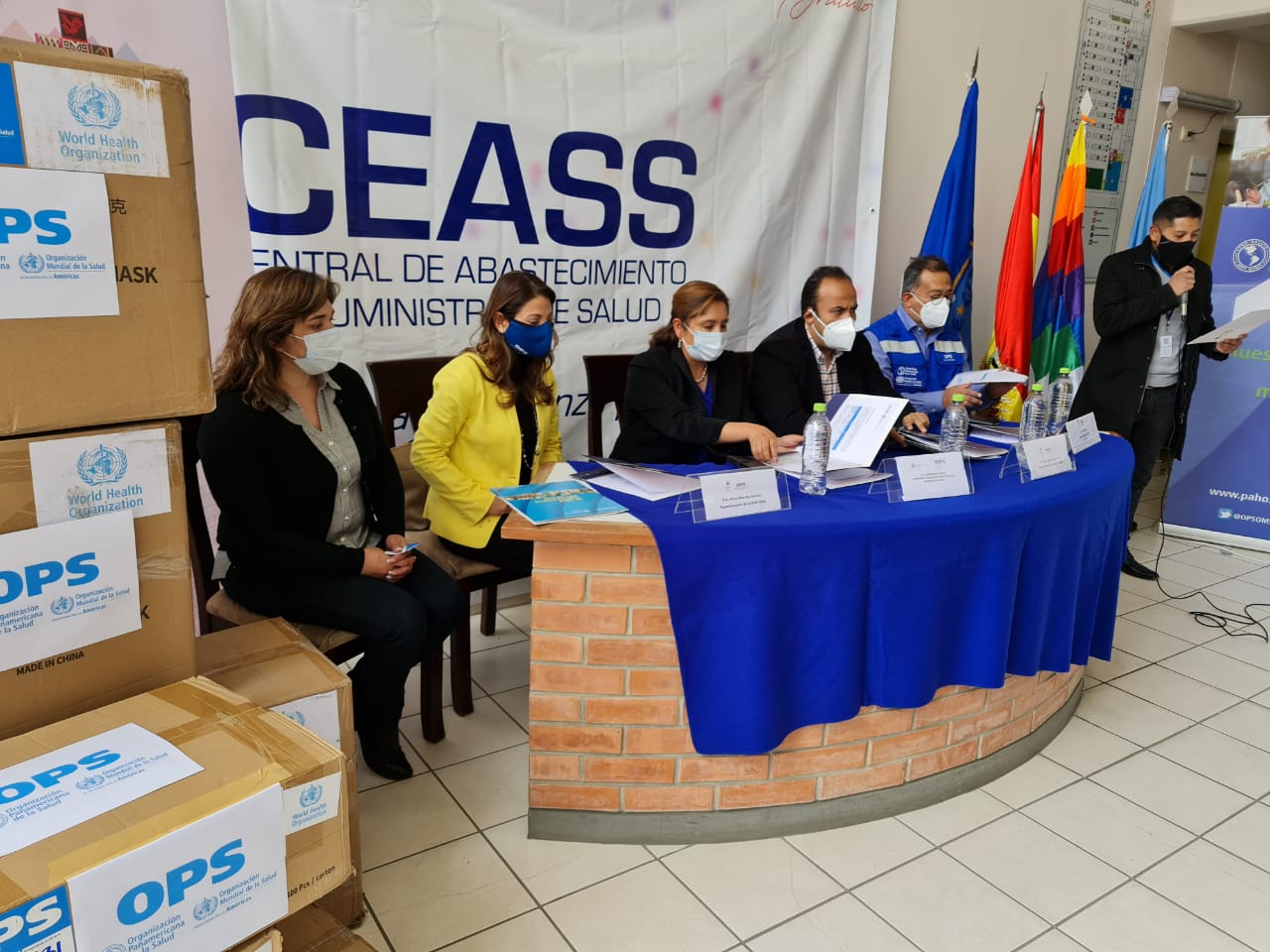 Con presencia del Ministro de Salud y Deportes, Dr. Jeyson Auza y la Representante de OPS/OMS Dra. Alma Morales Salinas en ambientes de la Central de Abastecimiento y Suministros de Salud (CEASS) se realizó la entrega oficial de la donación consistente en 275 mil Mascarillas Quirúrgicas y 12 mil Respiradores KN95. El valor total de la donación corresponde a 104.975 dólares americanos.