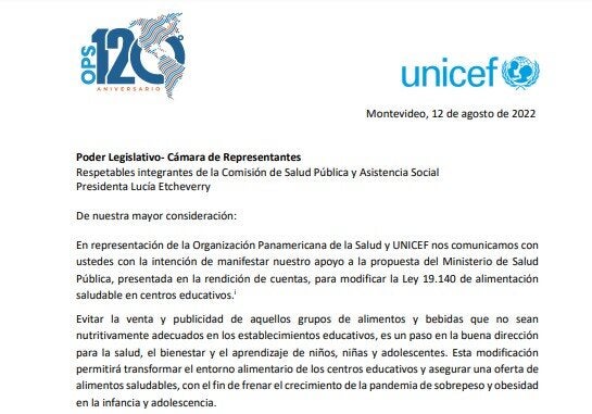 La Organización Panamericana de la Salud (OPS/OMS) y UNICEF en Uruguay remitieron una nota a las Comisiones de Salud de las cámaras de Senadores y Diputados del Poder Legislativo uruguayo en la que manifiestan su apoyo a la propuesta del Ministerio de Salud Pública de modificar la Ley 19.140 de alimentación saludable en centros educativos. El cambio propuesto apunta a que exista una mayor oferta de alimentos saludables en los centros educativos públicos y privados.
