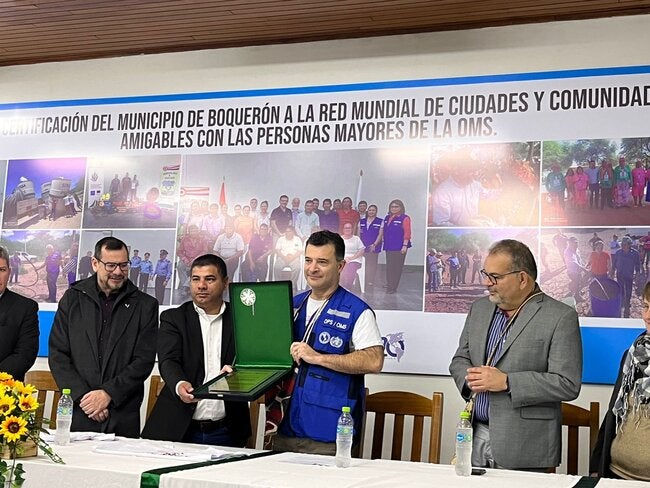 Boquerón, 14 de junio de 2023.- El Municipio de Boquerón del Chaco paraguayo ya es flamante miembro de la Red Mundial de Ciudades y Comunidades Amigables con las personas mayores de la OMS, siendo el primero del país en adherirse a esta Red. En ese marco, se llevó a cabo el acto de entrega de la Certificación al Municipio de Boquerón como miembro de la Red Mundial en un acto realizado en el Salón Municipal de la ciudad de Neuland distrito de Boquerón, situado en el Departamento de Boquerón.