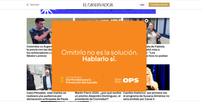 Dos de los principales medios de comunicación del país amanecieron con un disruptivo banner en sus plataformas digitales. En el centro de todas las noticias, los usuarios se encontraron con este mensaje: "Cada semana en Uruguay fallecen alrededor de 16 personas por suicidio."