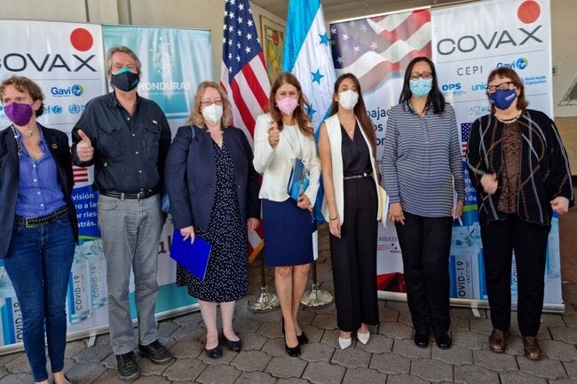 El año pasado, Honduras recibió 4,714,820 dosis de vacunas contra el COVID-19 a través de COVAX, de las cuales 3,876,880 de dosis fueron por donación de los Estados Unidos. La donación fue recibida en el Centro Nacional de Biológicos del Programa Ampliado de Inmunizaciones (PAI), con la participación de la Dra. Suamy Montalván, Viceministra de Salud; la Sra. Colleen Hoey, Encargada de Negocios de la Embajada de los Estados Unidos y la Magister Piedad Huerta, Representante de la OPS/OMS en Honduras.
