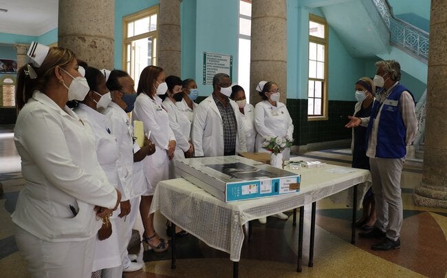 Al acto de entrega asistieron la Dra. Longina Ibargollen Negrín, asesora del Programa Materno Infantil (PAMI) del Ministerio de Salud Pública (MINSAP); la Dra. Damarys Álvarez Zapata y el Dr. Luis Salas Castillo, directora del hospital y punto focal de la red en esa institución, respectivamente; el Dr. Duniesky Cintra Cala, consultor de OPS/OMS en Cuba, y un grupo de enfermeras y otras especialistas que apoyan las labores del centro centinela.