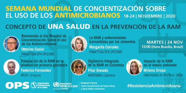En el marco de la Semana Mundial 2020, celebrada entre el 18 y el 24 de noviembre, PANAFTOSA realizará un seminario que abordará el concepto de Una Salud en la prevención de la RAM, el cual enfatiza la interrelación entre la salud de los seres humanos, los animales y los ecosistemas.