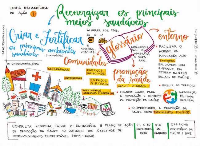 Las consultas nacionales sobre Promoción de la Salud de 2018, dirigidas por los Ministerios de Salud en colaboración con los puntos focales de los países dela Organización Panamericana de la Salud ( OPS/OMS) de la unidad de Promoción de la Salud y Determinantes Sociales de la Salud (FPLS / PS), culminan en el desarrollo de la Estrategia y el Plan de Acción sobre Promoción de la Salud en el contexto de los Objetivos de Desarrollo Sostenible (2019-2030) que se presentará en el 57.º Consejo Directivo de la OPS/OMS en 2019. La Estrategia y el Plan de Acción busca renovar la promoción de la salud a través de un movimiento social, político y técnico, abordando los determinantes sociales de salud para mejorar la salud y reducir las inequidades en salud en el marco de la Agenda 2030 para el Desarrollo Sostenible. Sus cuatro líneas estratégicas son las siguientes: