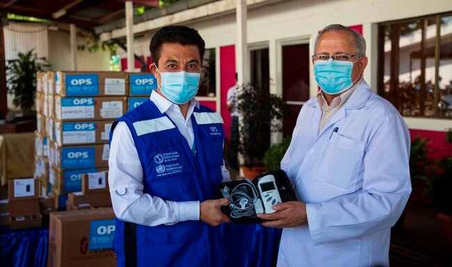 Managua, Nicaragua 19 de abril del 2021 (OPS/OMS).- La OPS/OMS en Nicaragua, donó al Ministerio de Salud equipos médicos e insumos de protección personal, para contribuir a fortalecer la atención que se da a las personas afectadas por la COVID-19, así como las medidas de protección del personal de salud.