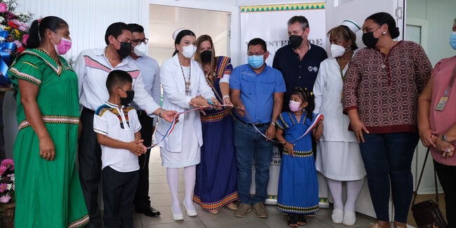 Panamá, 2 de diciembre de 2021 (OPS) – Con el objetivo de fortalecer el seguimiento epidemiológico y los servicios de inmunización de la Comarca Ngäbe‐Buglé en el marco de la pandemia COVID‐19 , la representación de la Organización Panamericana de la Salud/Organización Mundial de la Salud (OPS/OMS) en Panamá realizó la donación y entrega oficial de la edificación modular multi uso, debidamente equipada con sala de situación, depósito para biológicos y puesto de vacunación, a la Dirección Regional de Salud de la Comarca Ngäbe-Buglé del Ministerio de Salud.