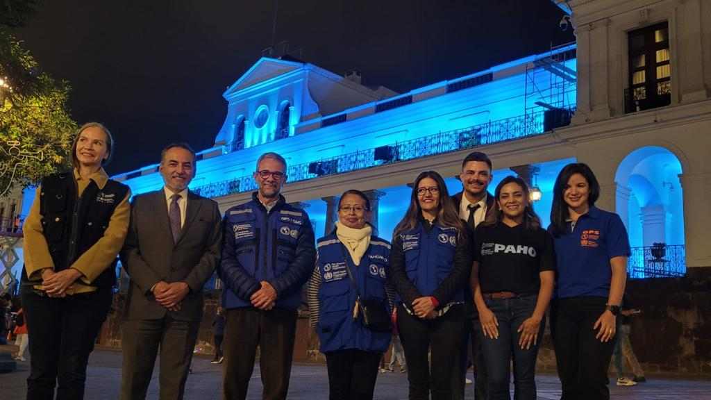 Quito, 2 de diciembre del 2022.- Sumándose a los homenajes que varias instituciones públicas del Ecuador han presentado a la Organización Panamericana de la Salud (OPS) por el despliegue de su cooperación técnica en la región desde 1902, el Municipio de Quito y la Presidencia de la República iluminaron sus palacios con los colores institucionales de la organización.