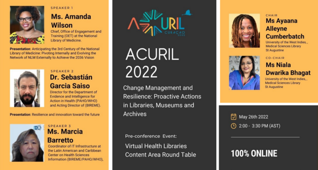 La Association of Caribbean University, Research and Institutional Libraries (ACURIL) celebra su conferencia de 2022 bajo el tema Gestión del cambio y resiliencia: acción proactiva en las bibliotecas, museos y archivos del Caribe. El evento previo a la conferencia celebrado el 26 de mayo trajo la mesa redonda de Contenidos de la Biblioteca Virtual en Salud (BVS), que contó con las presentaciones de Amanda Wilson, Chief, Office of Engagement and Training, National Library of Medicine (NLM), Sebastián García Saisó, Director del Departamento de Evidencia e Inteligencia para la Acción Sanitaria de la Organización Panamericana de la Salud/Organización Mundial de la Salud (OPS/OMS) y Director a. i. del Centro Latinoamericano y del Caribe de Información en Ciencias de la Salud (BIREME/OPS/OMS), y Marcia Y. Barretto, Coordinadora de Infraestructura de Tecnologías de la Información, Gestión Administrativa y Gestión de Planificación en BIREME/OPS/OMS. Este acto fue presidido por Ayaana Alleyne Cumberbatch, de la Biblioteca de Ciencias Médicas, University of West Indies, en St. Augustine.