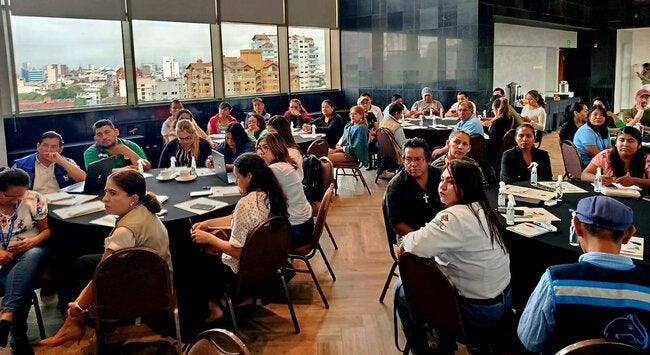 Participan del taller que tiene lugar en Santa Cruz de la Sierra, del 20 al 22 de mayo, servidores públicos del Ministerio de Salud y Deportes de Bolivia, del Servicio Nacional de Sanidad Agropecuaria e Inocuidad Alimentaria (SENASAG), y del Centro Nacional de Enfermedades Tropicales (CENETROP).