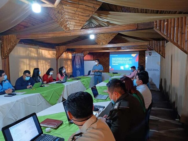 Baños de Agua Santa, 20 de agosto del 2022.- Durante tres días, desde el 17 al 19 de agosto, 32 funcionarios del Ministerio de Salud Pública (MSP), Servicio Nacional de Atención Integral a Personas Adultas Privadas de la Libertad y Adolescentes Infractores (SNAI), Policía y Bomberos participaron en el taller “Manejo de Crisis Sanitaria en Centros de Privación de Libertad frente a la Pandemia por la COVID-19".