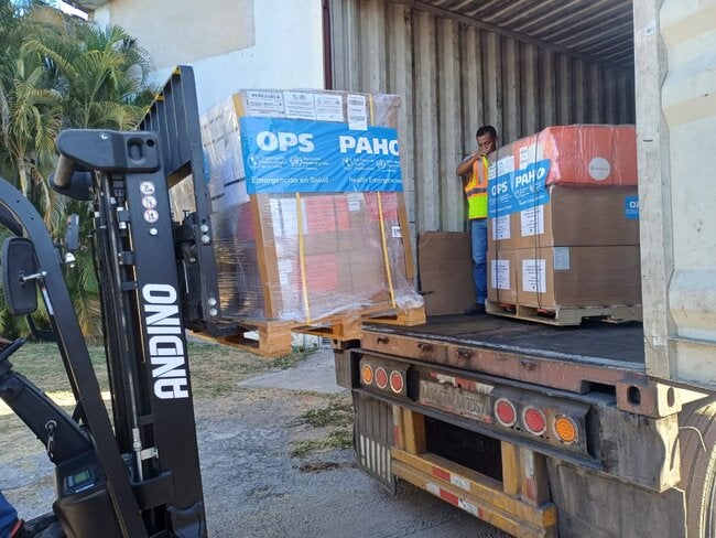 Caracas, 21 de enero de 2026 (OPS/OMS).- La Organización Panamericana de la Salud (OPS) recibió esta semana 3,16 toneladas de kits para manejo de emergencias hospitalarias y quirúrgicas, kits de protección personal y mochilas para atención de emergencias, los cuales pondrá a disposición del Ministerio del Poder Popular para la Salud (MPPS).