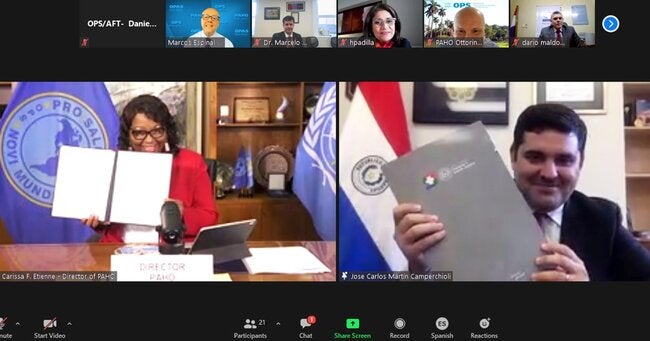 Rio de Janeiro, Brasil, 22 de julio de 2021 (PANAFTOSA/SPV-OPS/OMS). –La Doctora Carissa F. Etienne, Directora de la Organización Panamericana de la Salud y el Doctor José Carlos Martin Camperchioli, Presidente del Servicio Nacional de Calidad y Salud Animal (SENACSA) de Paraguay firmaron el Convenio Constitutivo para el establecimiento del banco regional de antígenos de fiebre aftosa (BANVACO). Paraguay es el primer país de Sudamérica que firma el convenio constitutivo del BANVACO, el cual requiere la participación de tres países para iniciar sus acciones como un proyecto regional.